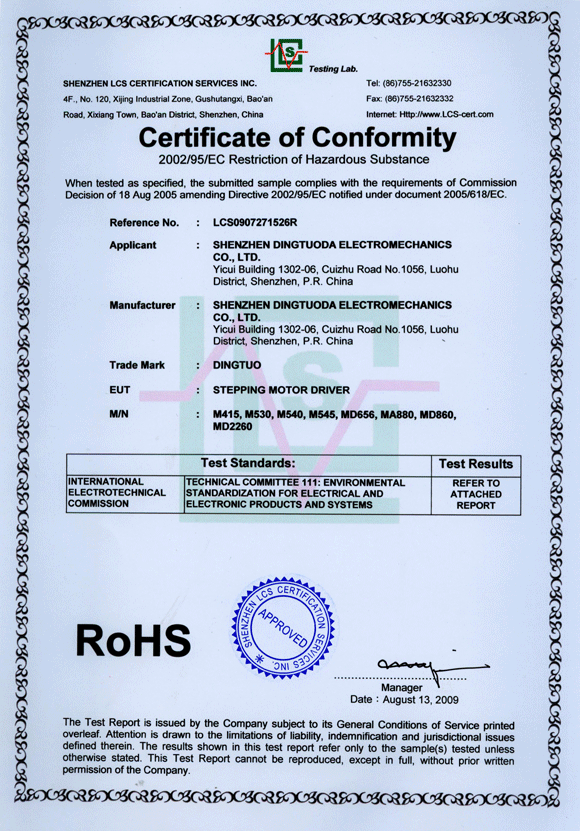 步進(jìn)驅(qū)動器RoHS認(rèn)證證書